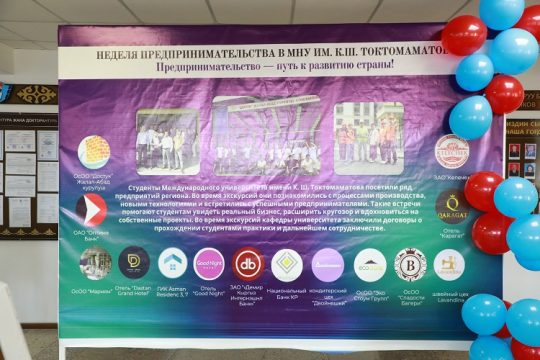 В Международном университете имени К.Ш. Токтомаматова (г. Джалал-Абад, МНУ) широко отметили 20 сентября – День предпринимателя Кыргызской Республики. Названное мероприятие проводилось под девизом «Предпринимательство – движущая сила экономики!». В рамках мероприятия студенты МНУ посетили ряд частных предприятий города, а именно ОАО «Келечек», кондитерские предприятия «Двойняшки» и «Сладости Багери», строительная компания ЗАО «Достук», швейный цех «Лавандина», камнеобрабатывающее предприятие «Эко Стоун Групп», гостиницы «Карагат», «Дастан», «Гуд Найт», мукомольный комбинат «Мариям», коммерческие банки «Демир Банк», «Оптима Банк» и др. Вместе с этим была проведена фотовыставка деятельности частных предприятий города, ярмарка продукции ОАО «Келечек», ярмарка образцов предпринимательской деятельности студентов университета и его колледжей. Организаторами праздничного мероприятия выступили кафедра экономики и финансов (зав. кафедрой к.э.н., доцент Н.К. Токтомаматова) Института непрерывного открытого образования, кафедра экономики, менеджмента и туризма (зав. кафедрой PhD, доцент Д.Л. Юлдашев) Международного Кыргызско-Турецкого института, кафедра учетно-финансовых дисциплин (зав. кафедрой Г.И. Топчубаева) Гуманитарно-экономического колледжа, а также молодежная предпринимательская организация «Энактас МНУ» (лидер Н.Т. Сариева). Как известно общественности, в МНУ осуществляется подготовка специалистов по направлению «Экономика», профилям «Финансы и кредит», «Экономика и управление на предприятии», «Бухгалтерский учет, анализ и аудит», по направлению «Туризм», в колледжах МНУ осуществляется подготовка специалистов по специальностям «Экономика и бухгалтерский учет», «Банковское дело», «Туризм», которые изучают предпринимательскую деятельность, маркетинг, что позволяет в будущем успешно заниматься бизнесом. В связи с этим в МНУ ежегодно отмечают День предпринимателей, проводят показные мероприятия для продвижения предпринимательского движения, бизнес идей.