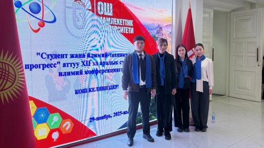 Студенты Международного университета имени К. Ш. Токтомаматова (МНУ, г. Манас) приняли участие в XII Региональной студенческой научной конференции «Студент и научно-технический прогресс», проведенное Ошским Госудраственным университетом 29 ноября 2025 года. По итогам конференции студенты МНУ показали хорошие результаты и заняли следующие призовые места за активное участие и лучшие научные статьи: 1-е место: по естественым наукам Д. А. Мамбеталиева; по информационным технологиям Б. Бактыбек уулу, Н. Н. Орозбеков; по экономике П. Н. Бекенова; 2-е место: по педагогике Г. Т. Закирова, А. К. Камчиева; по информационным технологиям У. Карагулова, Б. З. Мамасалиев, Н. Н. Орозбеков, С. А. Камалов, Б. Э. Шабданов; по юриспруденции Э. Т. Абжапарова, по бухгалтерскому учету Э. Кадырбекова; 3-е место: по бухгалтерскому учету Б. К. Дыйканова, по информационным технологиям А. Абдыжапарова; по юриспруденции Т. Ражапбаев. Поздравляем наших студентов с названными успехами, призовыми дипломами! Желаем им дальнейших побед и новых успехов! Особая благодарность научным руководителям студентов – профессорско-преподавательскому составу МНУ. Отдельная благодарность начальнику отдела науки, аспирантуры и докторантуры к.полит.н., доценту А.С. Калиеву за четкую организацию и успешное участие команды МНУ в вышеназванной конференции!