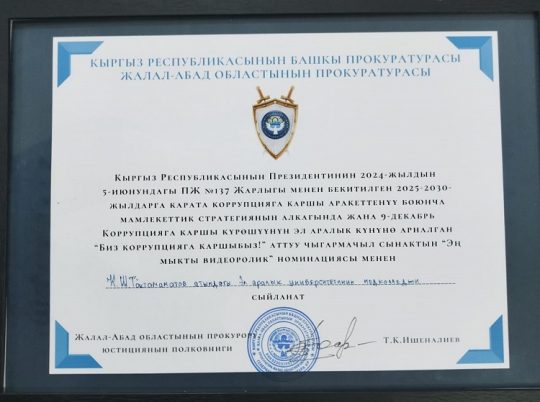 Үстүбүздөгү жылдын 10-деабрында Жалал-Абад областтык Прокуратурасы 9-декабрь – Коррупция менен күрөшүүнүн бүткүл дүйнөлүк күнүнө арналган иш-чаралар алкагында жарыяланган “Биз коррупцияга каршыбыз!” аттуу чыгармачылык сынагынын жыйынтыгын чыгарды. Аталган сынактын шарттары боюнча жогорку жана орто кесиптик окуу жайлардын студенттери коррупция менен күрөшүү темасында көркөм видео тасмаларды тартышкан. Сынактын жыйынтыктары боюнча К.Ш. Токтомаматов атындагы Эл аралык университеттин (ЭАУ, Манас шаары) студенттеринин 2 видео тасмасы байгелүү орундарга жетишти, алар: 1) башкы сыйлык – гран-при – ЭАУнун Эл аралык Медициналык колледжинин 1-2-3-курстарынын студенттеринин медицина тармагындагы коррупция жөнүндө биргелешип тарткан видео тасмасы (режиссёр К.А. Сулайманов, оператор Р. Мурзабеков); 2) “Эң мыкты видео ролик” номинациясында сыйлык – ЭАУнун Үзгүлтүксүз ачык билим берүү институтунун “Юриспруденция” багытындагы 2-курсунун студенттеринин шайлоо тутумундагы коррупция жөнүндө видео тасмасы (режиссёр Д.Т. Асилбеков, оператор Э. Абжапарова). Жалал-Абад областтык прокуратурасы аталган байгелүү орундарды ээлеген жана жигердүү катышкан чыгармачыл топторду атайын дипломдор, баалуу сыйлыктар менен сыйлады. Жогоруда аталган ЭАУнун студенттеринин чыгармачыл топторун айтылган ийгиликтери менен чын жүрөктөн куттуктайбыз, мындан да жогору ийгиликтерди каалайбыз!