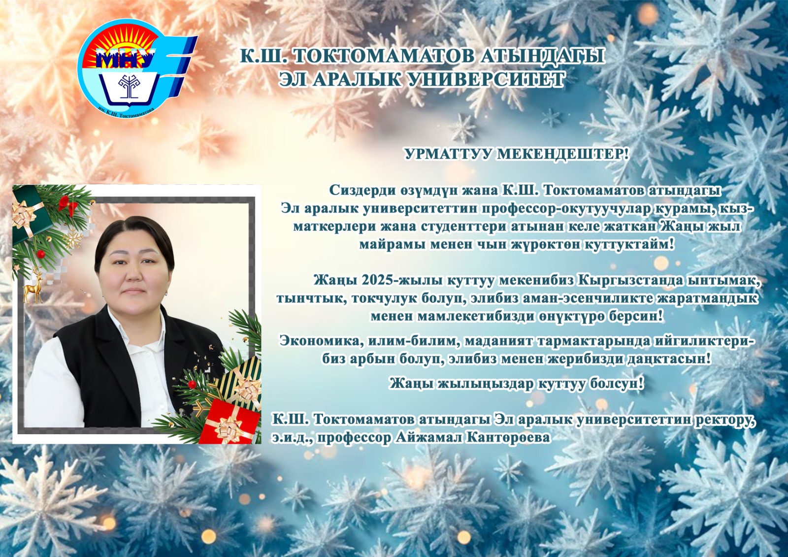 Сиздерди өзүмдүн жана К.Ш. Токтомаматов атындагы Эл аралык университеттин профессор-окутуучулар курамы, кызматкерлери жана студенттери атынан келе жаткан Жаңы жыл майрамы менен чын жүрөктөн куттуктайм!