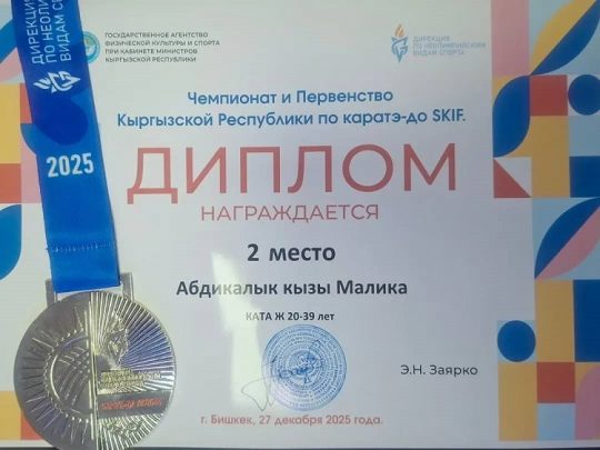 Үстүбүздөгү жылдын 27-декабрында борбор калаабыз Бишкекте Кыргыз Республикасынын Каратэ-до SKIF боюнча чемпионатында К.Ш. Токтомаматов атындагы Эл аралык университеттин «Юриспруденция» багыты боюнча 2-курсунун магистранты Абдикалык кызы Малика 20-39 жаштагы спортсмен кыздар арасында 2-орунду ээледи! Магистрантыбыз Абдикалык кызы Маликаны аталган спорттук ийгилиги менен чын жүрөктөн куттуктайбыз жана мындан жогору ийгиликтерди каалайбыз!