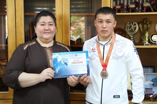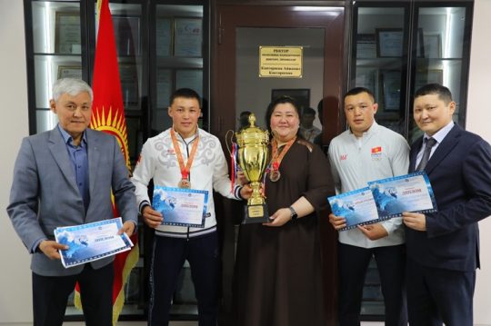 В рамках Универсиады высших учебных заведений Кыргызской Республики, проводимой в Бишкеке, 3-4 апреля этого года проводились соревнования по самбо. Сборная Международного университета имени К.Ш. Токтомаматова (МНУ, г. Манас) заняла 1-е место в общекомандном зачете 1-й лиги. Ректор МНУ, д.э.н., профессор Айжамал Кантороева тепло встретила студентов сборной МНУ по самбо и от души поздравила их со спортивным успехом, пожелала им новых высоких спортивных достижений. В сборной МНУ также индивидуальных успехов добились следующие студенты-спортсмены: 1-е место — Орозбеков Келечек – 4-й курс, направление “Физическая культура”, Каленов Барсбек – 4-й курс, направление “Физическая культура”, Кыргызалиев Бекмурат – 2-й курс, направление “Физическая культура”, Камытов Бектур – 2-й курс, направление “Юриспруденция”; 2-е место – Токторалиев Бекназар – 4-й курс, направление “Физическая культура”, Жаанбаев Эсенгелди – 2-й курс, направление “Юриспруденция”; 3-е место – Осконбаев Байжигит – 4-й курс, направление “Физическая культура. Тренер: кандидат в мастера спорта по самбо Орозбеков Кубат – преподаватель кафедры физической культуры и спорта МНУ, заведующий кафедрой доцент Амиракулов Урматбек. Как отметил проректор по воспитательной работе, к.фил.н., проф. Анвар Жолдошбаев, физическая культура и спорт являются важнейшими составляющми обучения и воспитания студентов МНУ, учитывая это в вузе ежегодно проводятся осенняя и весенняя спартакиады студентов, а также различные спортивные состязания по различным видам спорта. В университете функционирует и спортивный клуб “Здоровье”. Необходимо подчеркнуть, что ректорат МНУ активно поддерживает студентов-спортсменов, участвующих в международных и республиканских соревнованиях, предоставляет льготы в оплате за обучение.